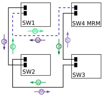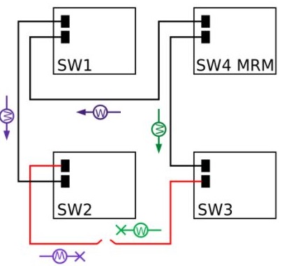This picture above shows an MRP ring in a closed condition. The MRM switch is the MRP Media Redundancy Manager and it is the designated switch that controls the ring and prevents the network loop from forming. “W” are the watchdog packets that transit the network much like RSTP BPDUs. If there is a line failure, the W frames alert the MRM to put its redundant port to forwarding.