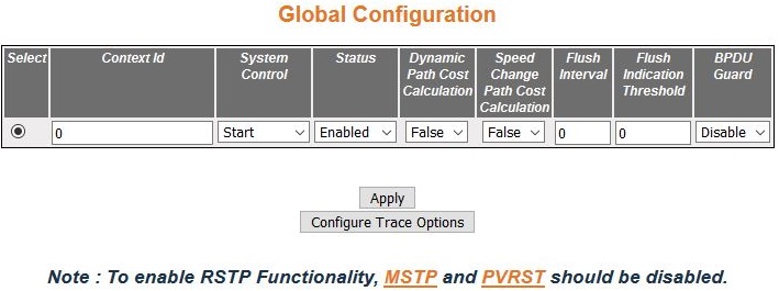 Note: To enable RSTP, MSTP and PVRSTP should be disabled in