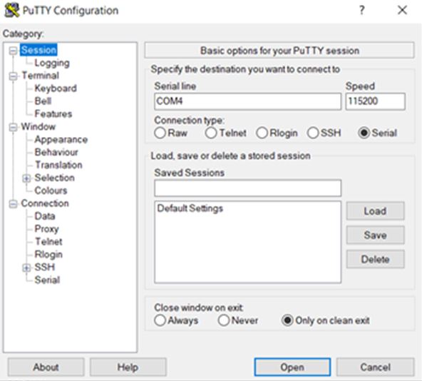 in Putty by selecting the Serial category